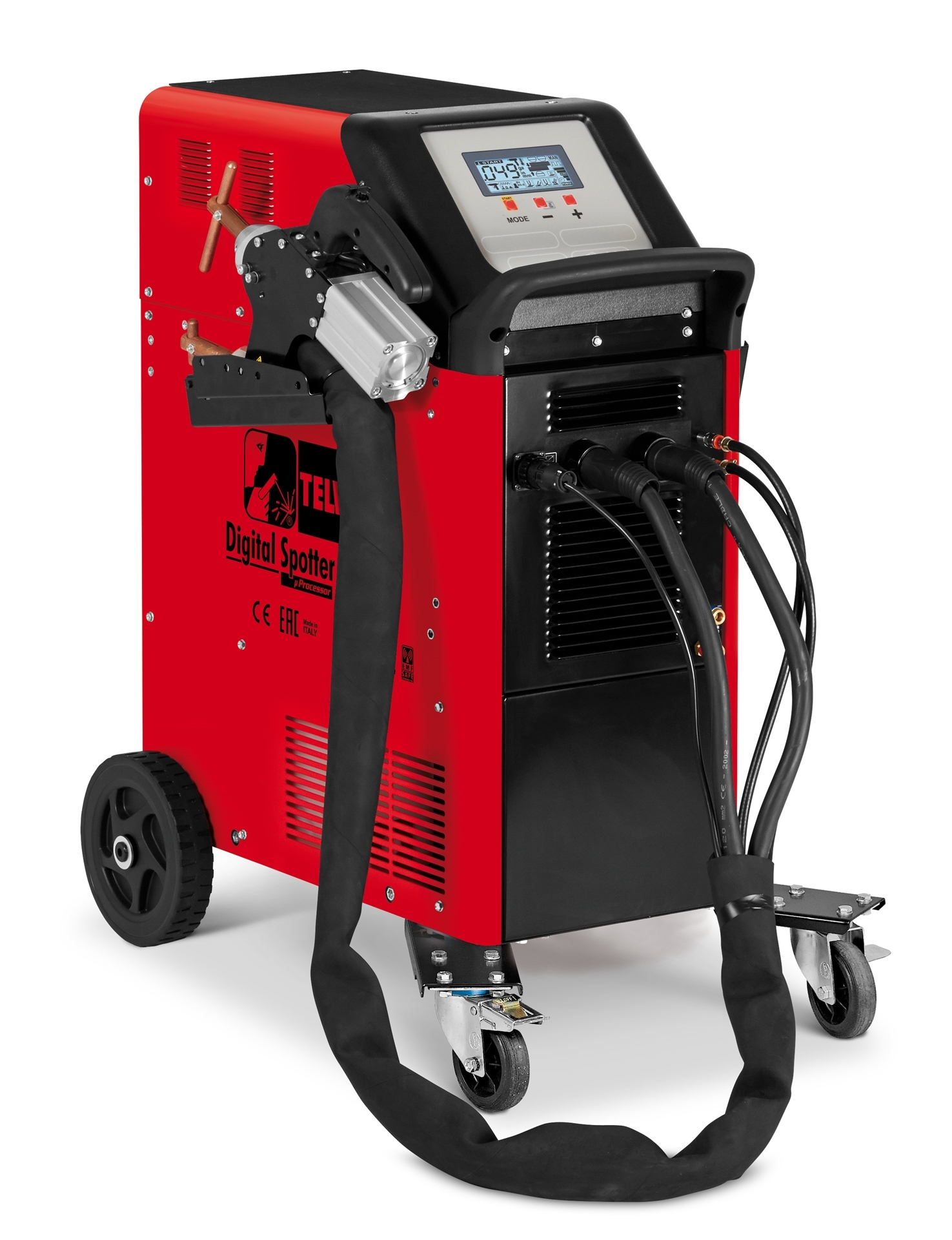 Elektronická mikroprocesorová multifunkčná bodová zváračka Digital Spotter 9000 Telwin s pulzným a jednosmerným režimom, vrátane HSS ready. Jednostranné a obojstranné bodovanie, žíhanie plechov, bodovania skrutiek, nitov, klincov, podložiek, kontaktov apod. s vodným chladením klieští. S použitím sady obj. Č. 802 833 možnosť použitia ako karosárske spotovačky ako Digital Car Spotter 5500