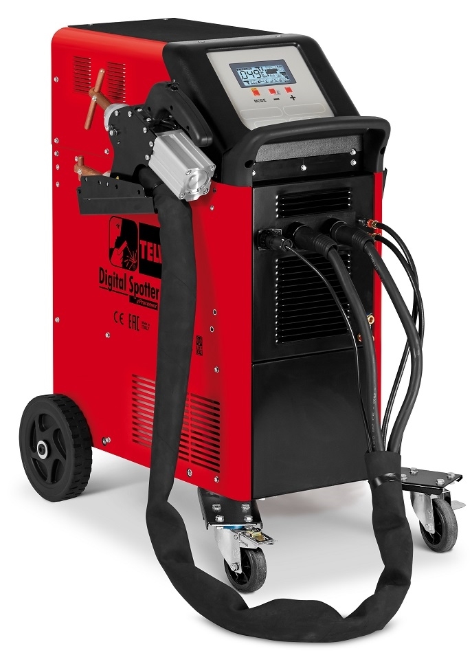 Elektronická mikroprocesorová multifunkčná bodová zváračka Telwin Digital Spotter 9000 s pulzným a jednosmerným režimom, vrátane HSS ready. Jednostranné a obojstranné bodovanie, žíhanie plechov, bodovania skrutiek, nitov, klincov, podložiek, kontaktov apod. Bodovacia kliešte ovládané a chladené vzduchom. Možnosť varianty s vodným chladením klieští. S použitím sady obj. Č. 802 833 možnosť použitia ako karosárske spotovačky ako Digital Car Spotter 5500