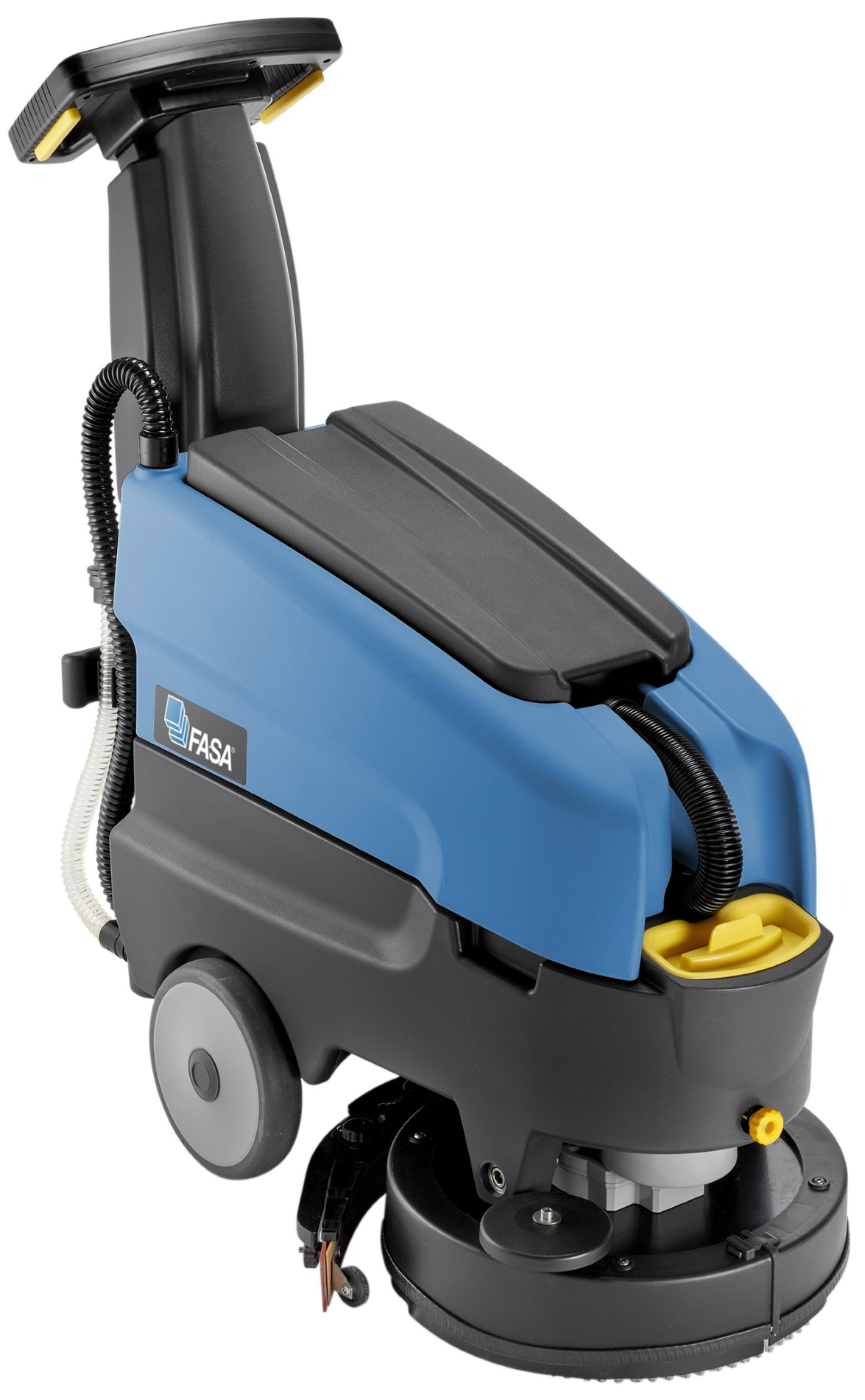 Čistiaci stroj na podlahu A1.5 36 B Fasa. Kompaktný batériový umývací stroj A1.5 36 B Fasa, napájanie 24 V, umývacia šírka 360 mm, dĺžka sušiace lišty 460 mm, otáčanie na malom priestore, systém rýchlej výmeny kotúča. Batérie sú súčačasťou základné výbavy.