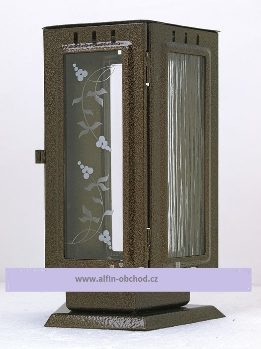 Lampáš na postavenie, lichobežníkový tvar, uchytenie na pomník hmoždinkou, farba staroměď.