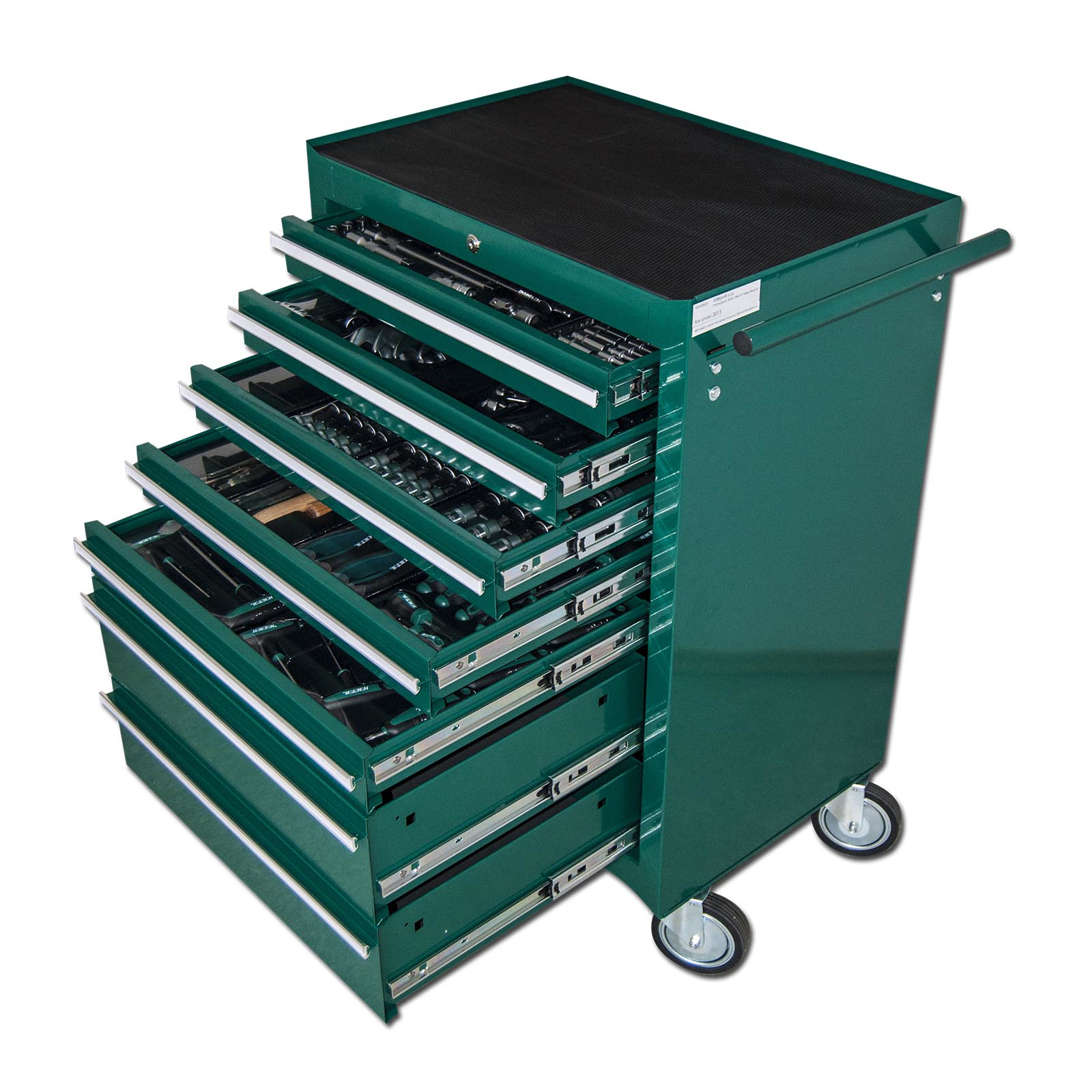 Kovový montážní vozík na nářadí se 7 zásuvkami. Dvě pevná a dvě otočná kolečka s poziční brzdou. Zásuvky na kuličkových ložiskách lze vysunout do 40cm. horní pracovní plocha i zásuvky jsou vypodloženy protiskluzovou podložkou. Držadlo pro manipulaci s vozíkem lze umístit z pravé nebo levé strany. Součástí jsou uzamykatelné 5 nízkých a 2 vysoké zásuvky.