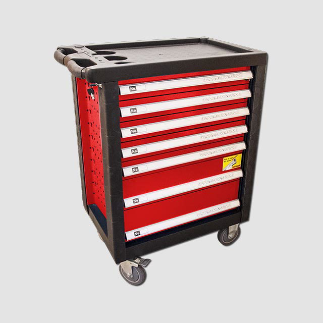 Kovový montážní vozík na nářadí se 7 zásuvkami. Dvě pevná a dvě otočná kolečka s poziční brzdou. Zásuvky na kuličkových ližiskách lze vysunout 40cm. horní pracovní plocha i zásuvky jsou vypodloženy protiskluzovou podložkou. Držadlo pro manipulaci s vozíkem lze umístit z pravé nebo levé strany. uzamykatelné zásuvky. 5 nízkých a 2 vysoké zásuvky.