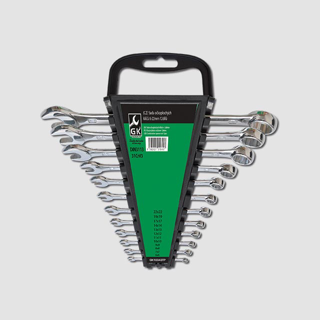 Sada očkoplochých klíčů je uložena v plastovém držáku. Klíče jsou z jedné strany ploché otevřené, ze strany druhé je dvanáctihranné očko.